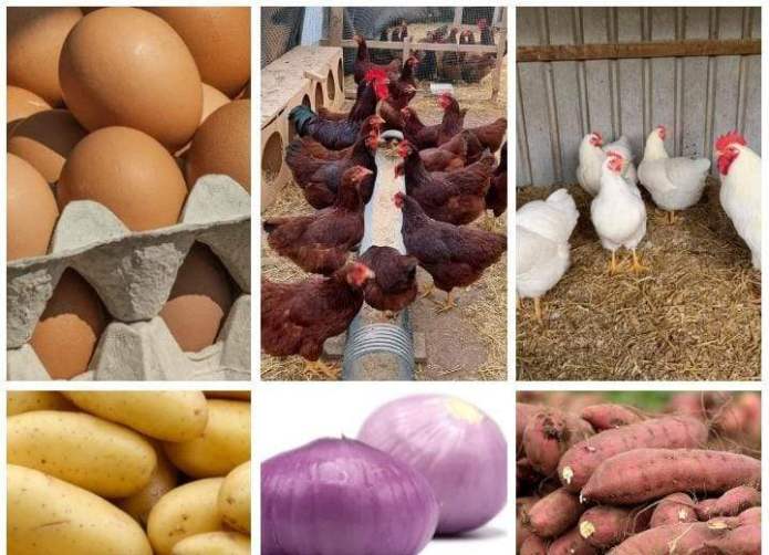 We sell eggs,chickens, irish potatoes, sweet potatoes and onoins